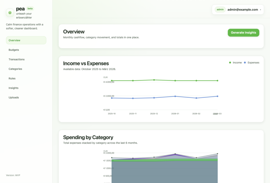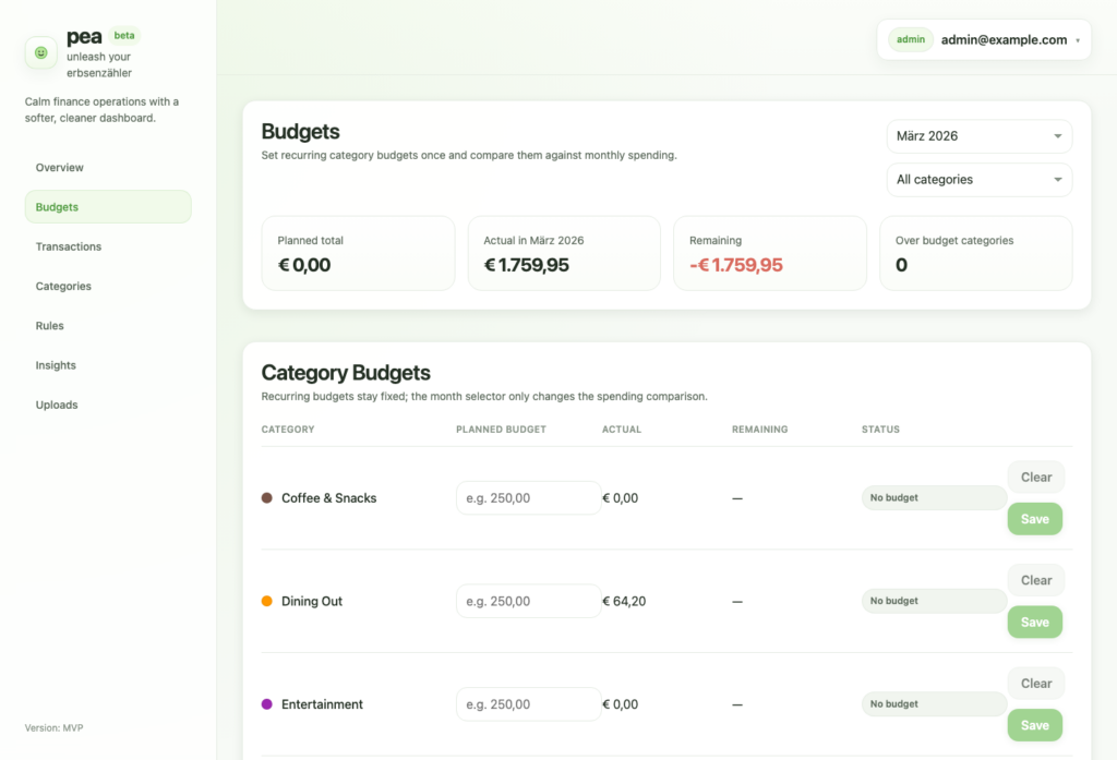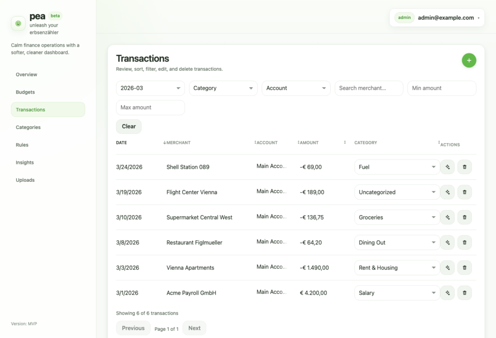 pea helps you keep personal or household finances structured without turning money management into a full-time job. It gives you one place to review transactions, manage categories, create rules, track monthly budgets, and understand where your money is actually going.